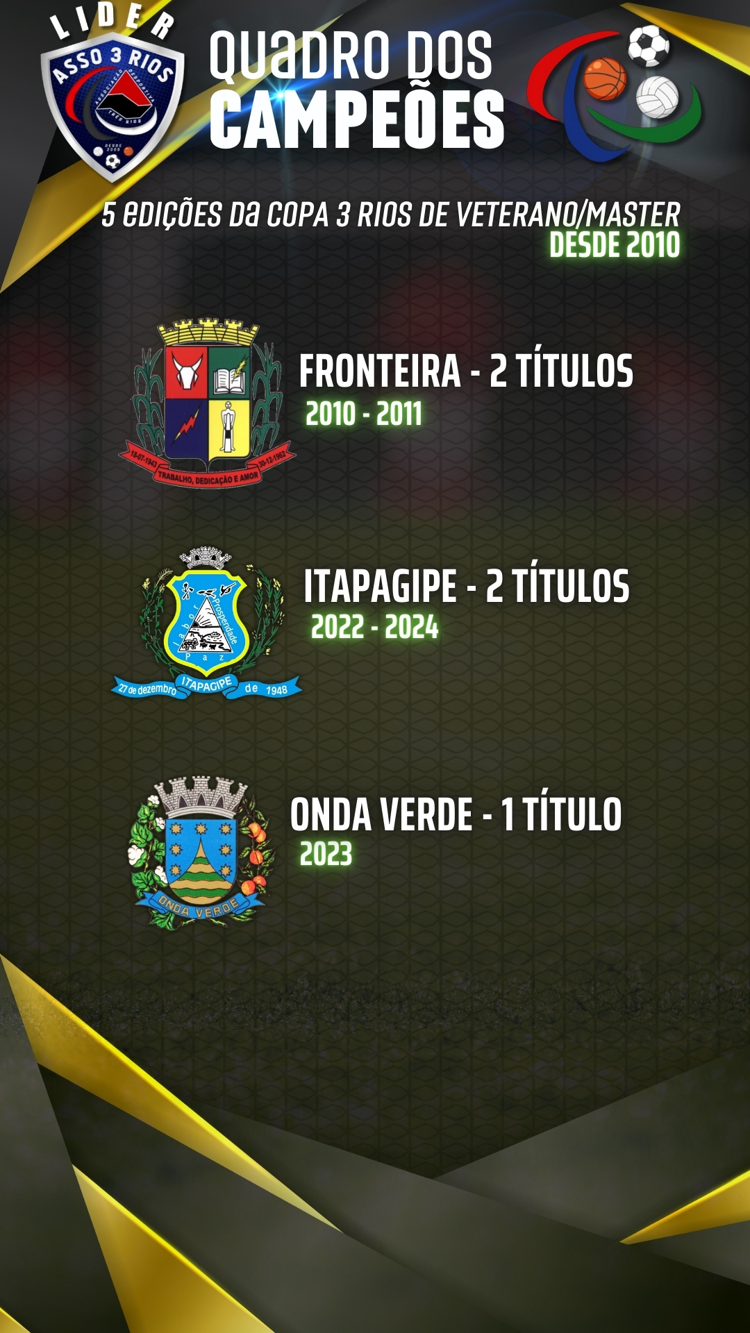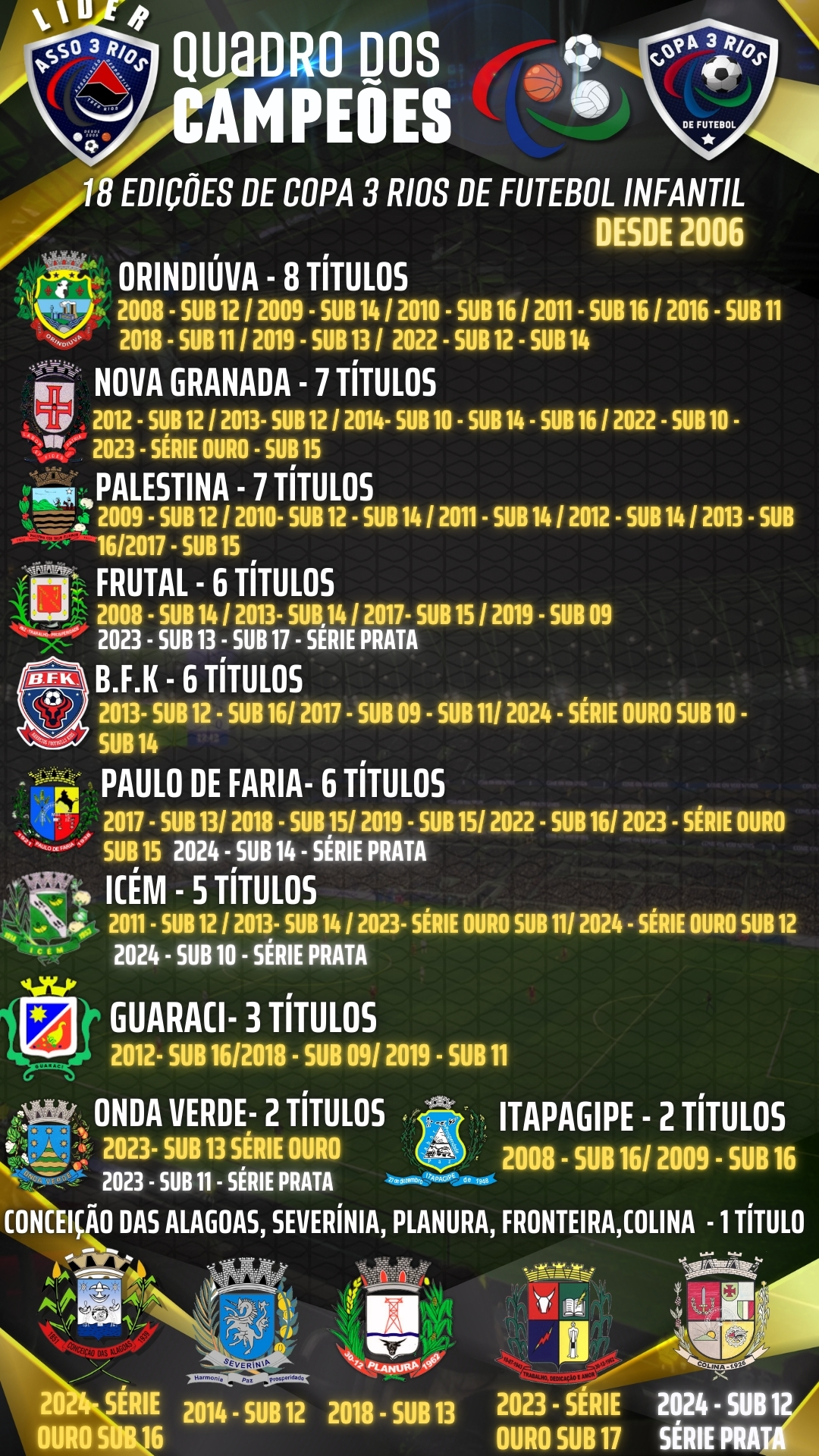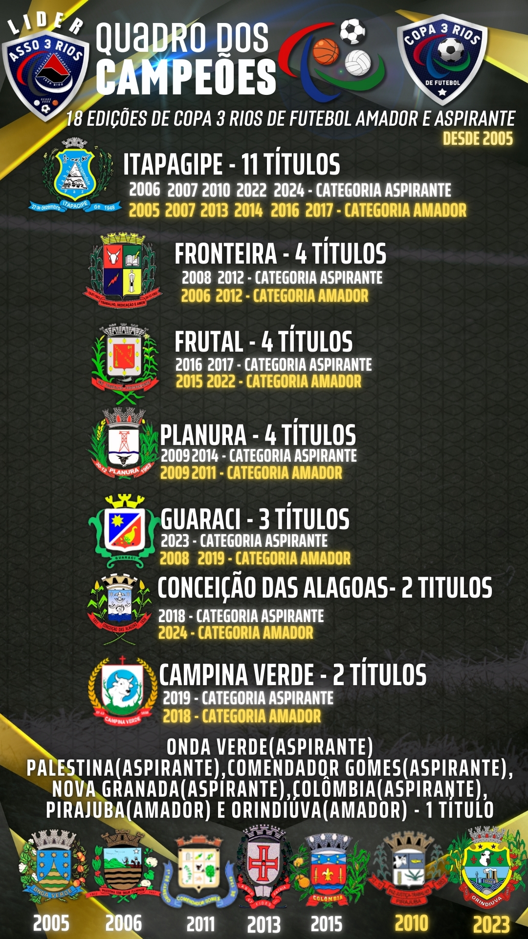 Idealizada em 2005 por um grupo de desportistas da região paulista, Márcio Sócrates – Patinho(Palestina-SP), Rogério Trindade(Guaraci-SP) e Antônio Junior- Português (Icém-SP), a Copa Três Rios de Futebol Amador teve sua primeira edição iniciada em Março daquele ano com 08 (oito equipes). Icém-SP, Orindiúva-SP, Guaraci-SP, Fronteira-MG, Itapagipe-MG, Onda Verde-SP e Palestina-SP e Colômbia-SP.